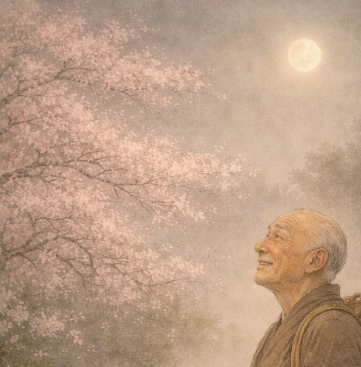In the hazy sky, Seigetsu gazes up at the cherry blossoms and the moon.