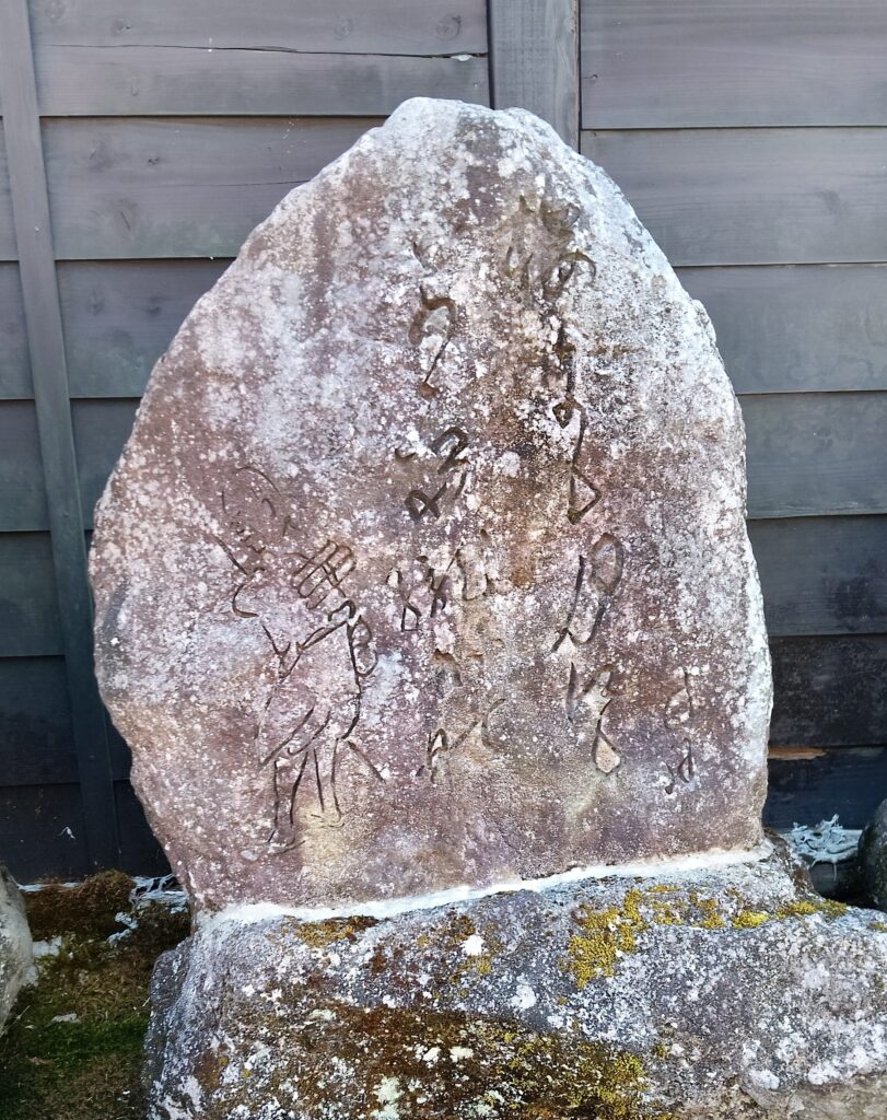 A monument inscribed with the haiku “A hazy mist hangs over both the cherry blossoms and the moon” and a portrait of Seigetsu.