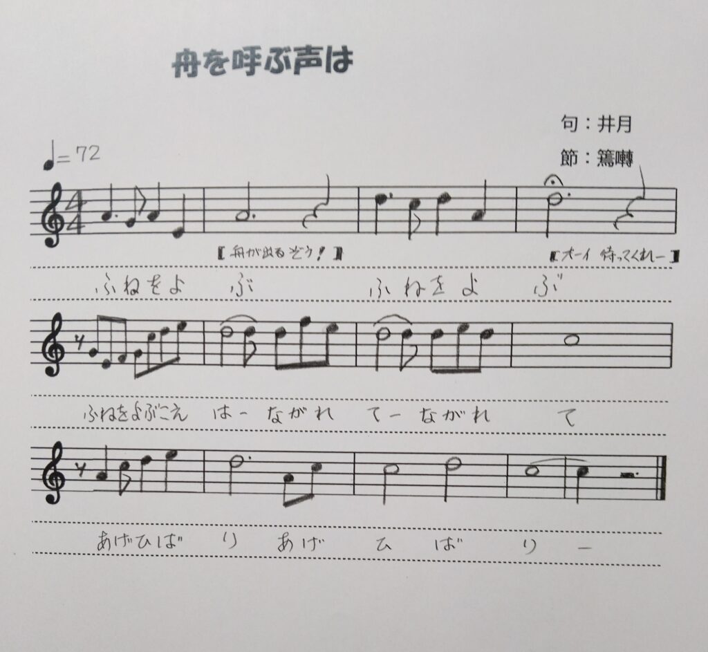 「篶囀の解釈」でも記した句の背景をイメージしてセリフを入れてみました。第2小節の「ぶ」の声を聴いてすぐに『舟が出るぞ~』のセリフを発し、第4小節の「ぶ」の声を聴いてすぐに『おーい、待ってくれ~』のセリフを発することを想定しています。