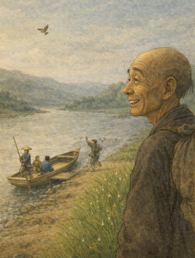 金銭などほとんど持たない井月ですが、ごく稀には自身も客人となって天竜川や三峰川などの渡し舟を利用したことがあったのではないでしょうか。それはともかく、この日ばかりは乗舟するつもりもなく、のんびりと丘の上からいつも見慣れた渡し場を眺めていたのでしょう。