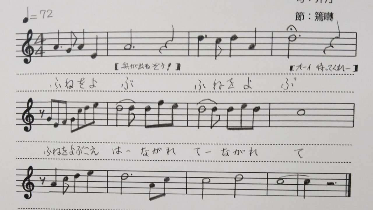 「篶囀の解釈」でも記した句の背景をイメージしてセリフを入れてみました。第2小節の「ぶ」の声を聴いてすぐに『舟が出るぞ~』のセリフを発し、第4小節の「ぶ」の声を聴いてすぐに『おーい、待ってくれ~』のセリフを発することを想定しています。