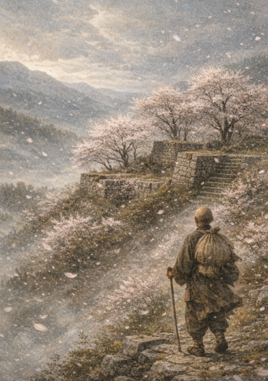 古城の跡に山桜が咲いている。強風に煽られ花びらはまるで嵐の如く。