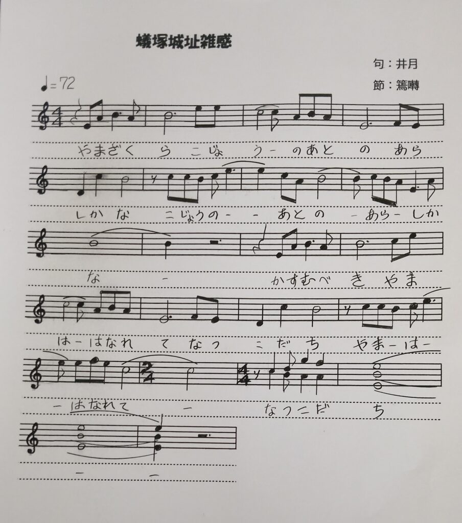 言葉の持つ高低アクセントと旋律が調和しないと落ち着かないのです。この点、いつものように『一句一旋律(曲)』なら容易に解決できるのですが、今宵は『二句一旋律となりましたので、少しばかり工夫を凝らしました。①の山桜に続く「古城⤵」と②の霞むべきに続く「山⤴」とが同じ旋律では納得できなかったのです。(生意気言ってるネ!)