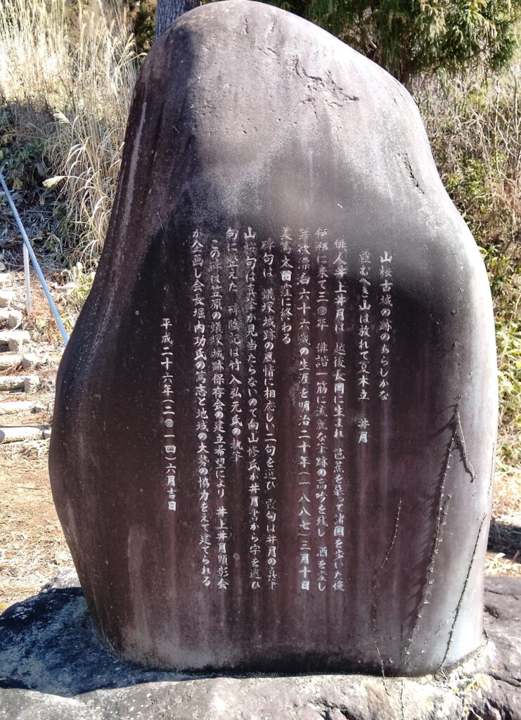 この蟻塚城跡の一角(御射山神社社屋の裏側付近)に平成26年に建立された井月の句碑があります。