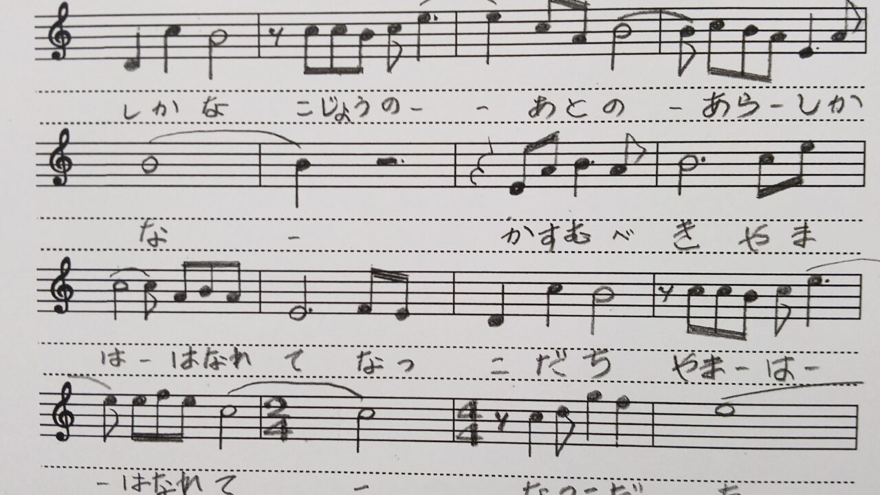 言葉の持つ高低アクセントと旋律が調和しないと落ち着かないのです。この点、いつものように『一句一旋律(曲)』なら容易に解決できるのですが、今宵は『二句一旋律となりましたので、少しばかり工夫を凝らしました。①の山桜に続く「古城⤵」と②の霞むべきに続く「山⤴」とが同じ旋律では納得できなかったのです。(生意気言ってるネ!)